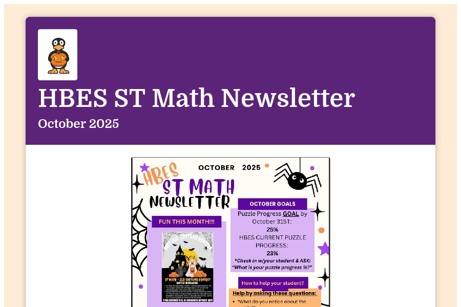 HBES ST Math Newsletter October 2025 HBES ST MATH NEWSLETTER Here is our ST Math family newsletter for the month of October. We are so pr. . .